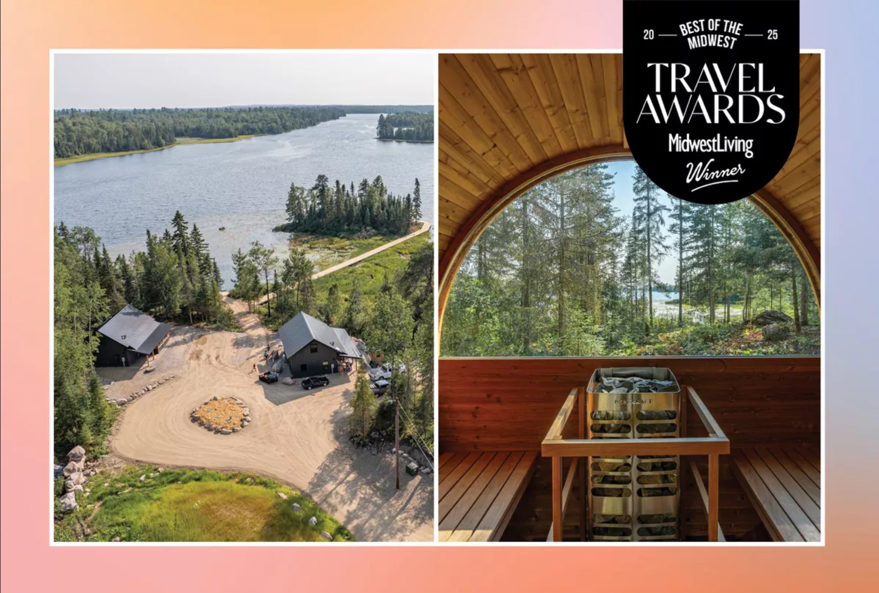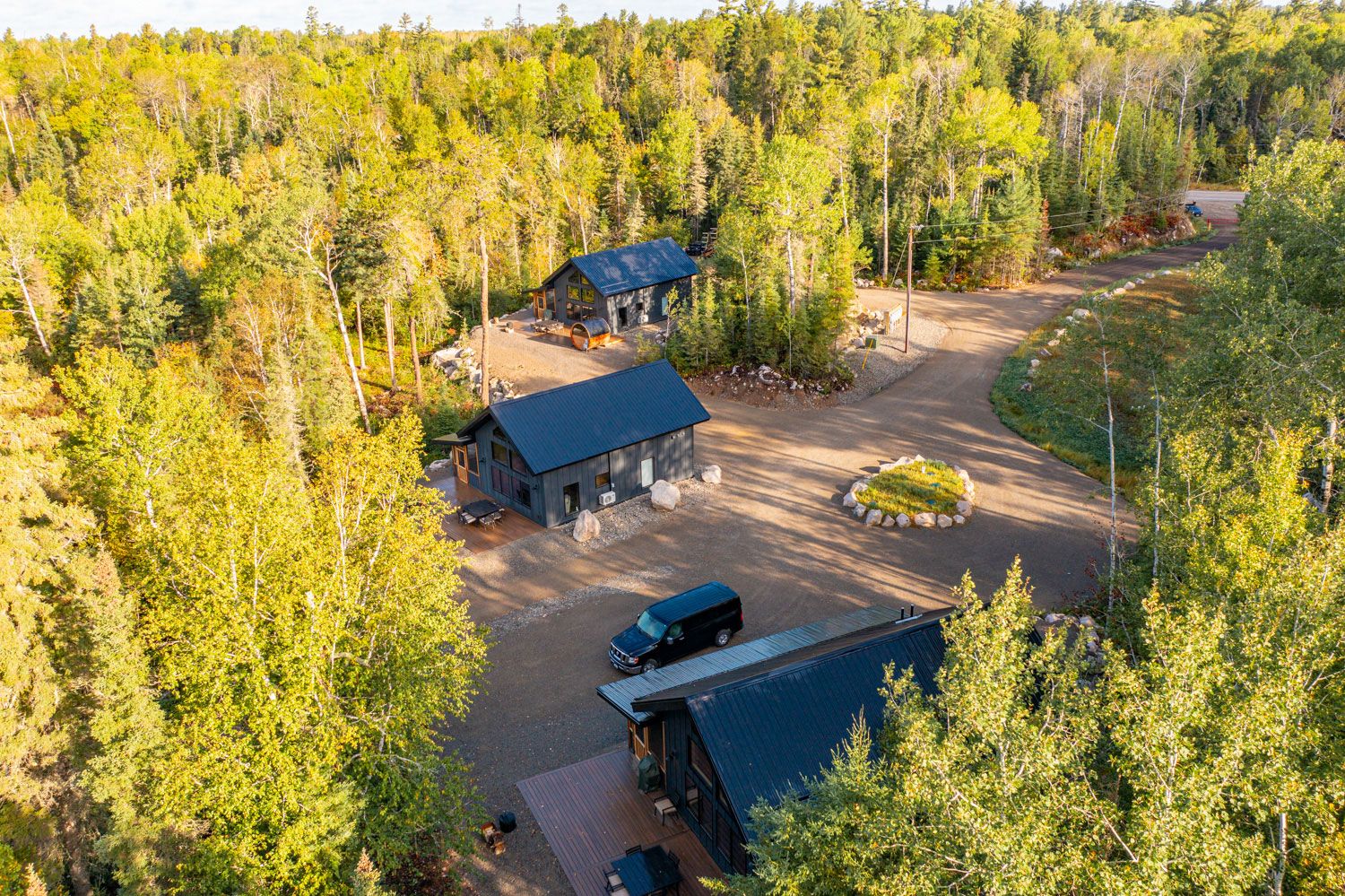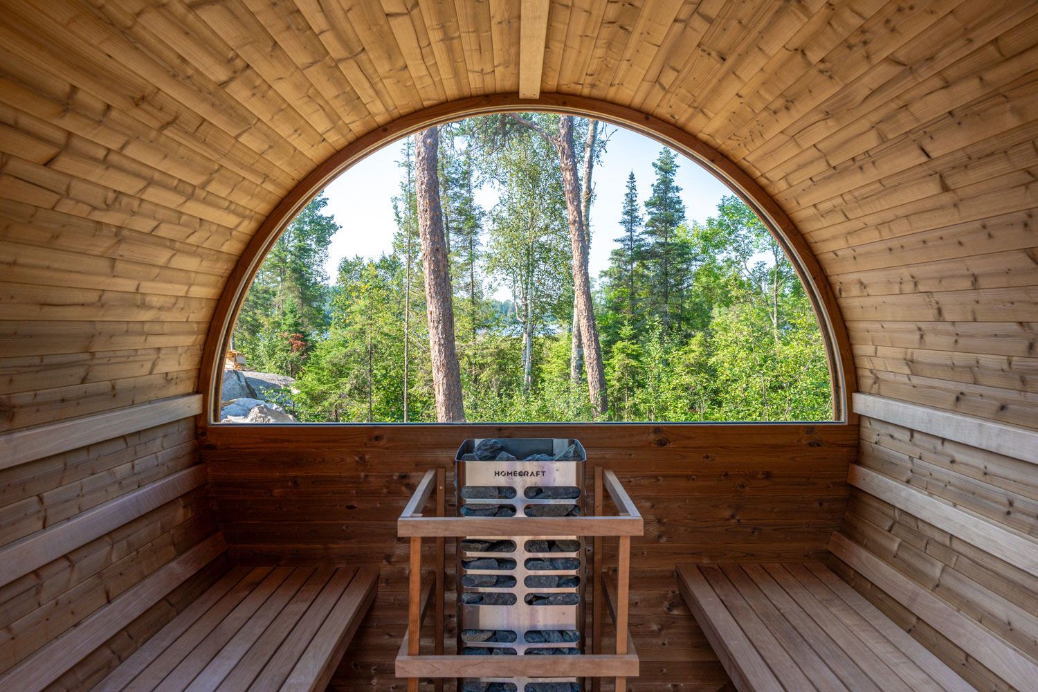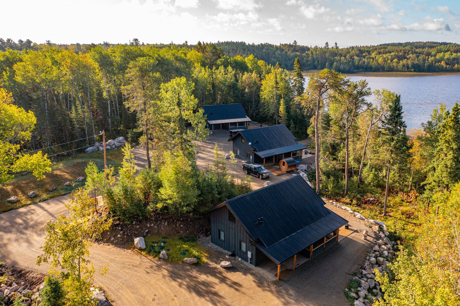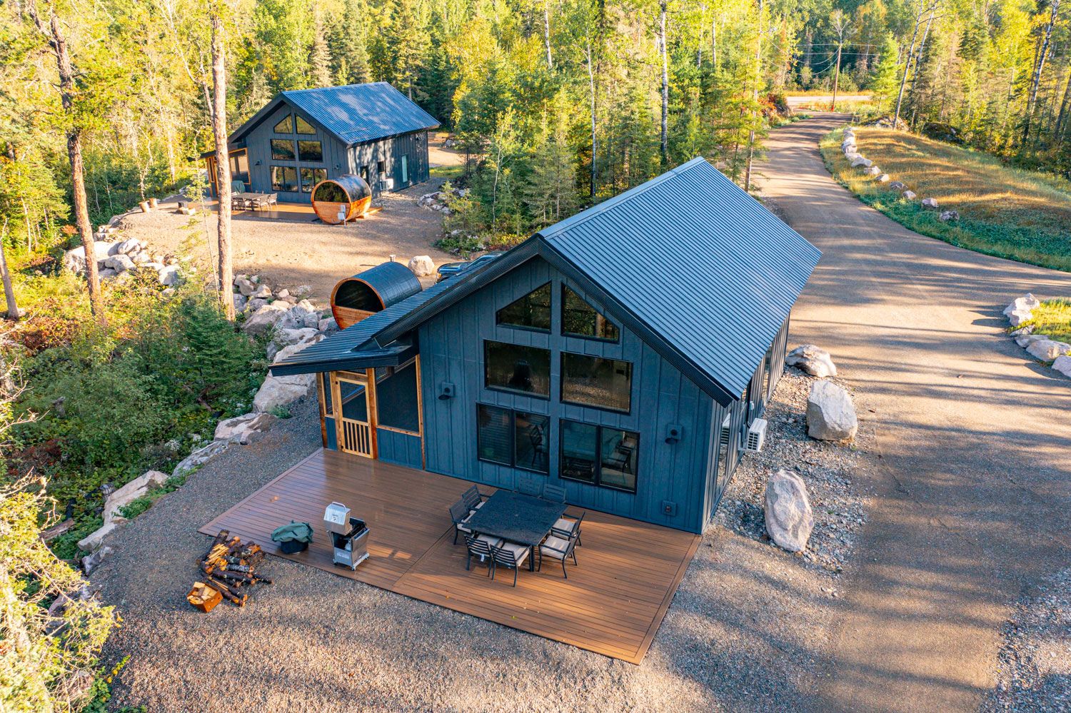 Cabin exteriors feature a large, panoramic deck with furniture, grill, Solo Stove, and adjacent private barrel sauna with lake views!